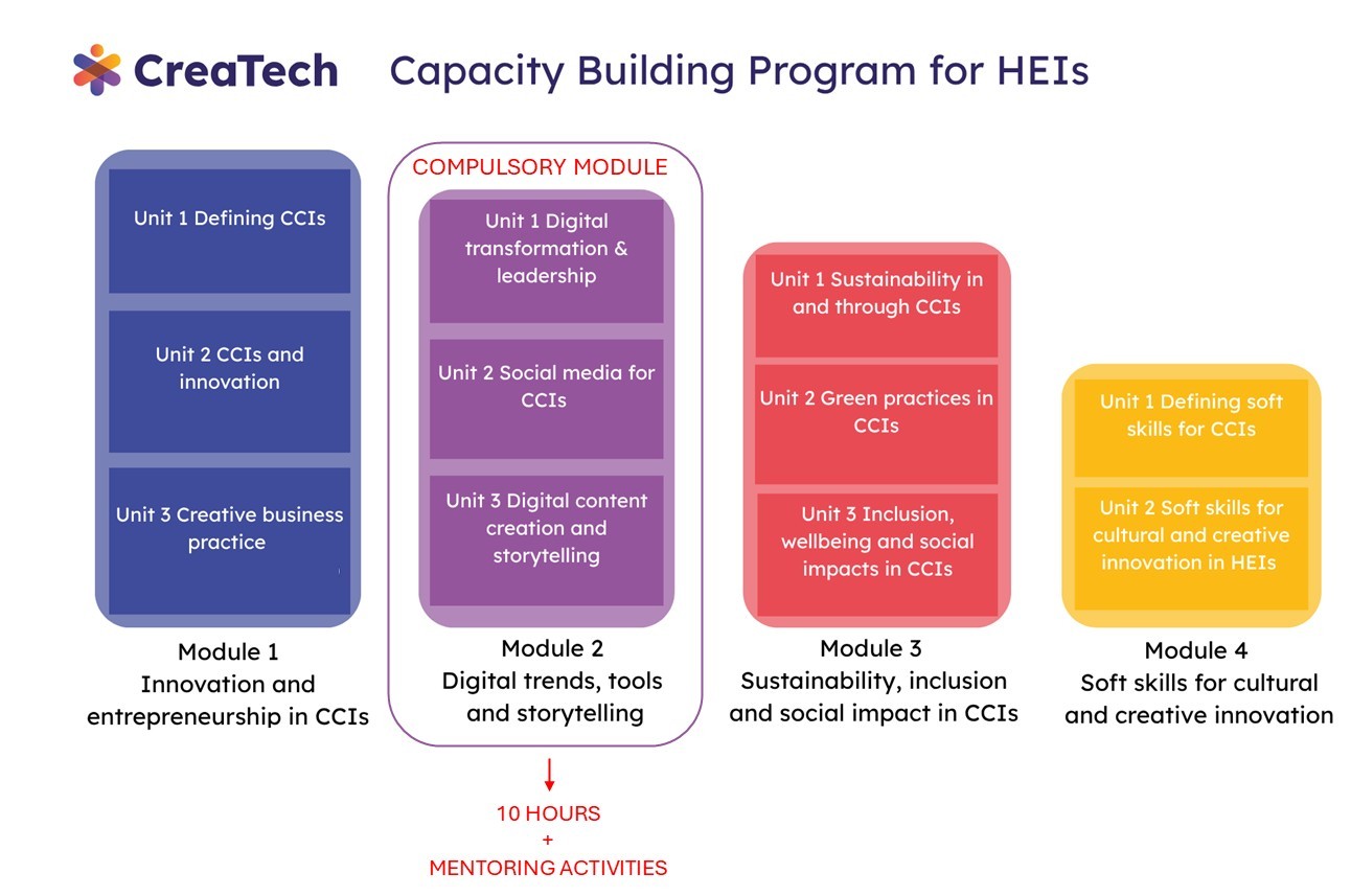 The Capacity Building Program is designed to enhance the capacity of academic and non-academic staff of HEIs involved in the CreaTech project to support innovation and entrepreneurship in CCIs. Through the Capacity Building Program and its four tailored modules, the project provides tools and training to integrate digital, green and social innovation strategies.